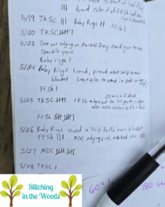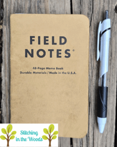 For my daily tracking, I use a Field Notes notebook and a Jetstream UniBall .5mm pen. I use this setup to document what I do each day with individual projects. If it has rows or rounds I use tally marks to show how many rows or rounds I did. If it’s something else like edging, weaving in ends, a partial row, tearing something out, etc. then I write that out. This is often where I’ll first write down that I started or finished a project. I then transfer that information to my nicer notebook for my overall recordkeeping.